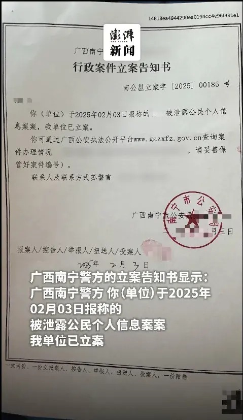 广西南宁警方的立案告知书显示:广西南宁警方,你(单位)于2025年02月03日报称的被泄露公民个人信息案案,我单位已立案。