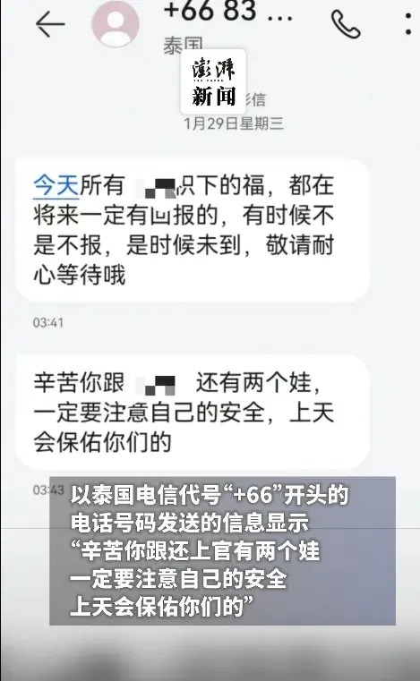以泰国电信代号“+66”开头的电话号码发送的信息显示:“辛苦你跟xx还有两个娃,一定要注意自己的安全,上天会保佑你们的”。